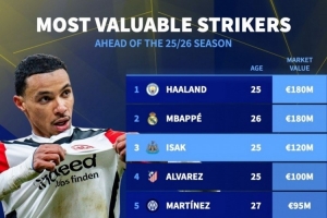 体育资讯7月22日讯 德国转会市场统计了中锋球员的身价,并列出榜单,哈兰德、姆巴佩、伊萨克前三,传闻即将转会利物浦的埃基蒂克排名第6位。