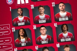 拜仁替补:26-乌尔赖希、48-克拉纳克、2-于帕梅卡诺、4-若纳坦-塔、6-基米希、8-格雷茨卡、9-凯恩、14-迪亚斯、17-奥利塞、27-莱默尔、36-维斯多姆-麦克、44-斯坦尼西奇