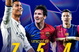 欧冠官方社媒晒出球员单赛季欧冠进球10+的次数,C罗7次、梅西5次、莱万4次,配文:“莱万本赛季会追平梅西吗?”