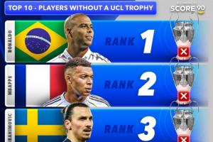 外媒Score90列无欧冠球员TOP10: