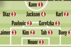 诺伊尔3分、莱默尔3分、金玟哉2分、塔3分、博伊3分、帕夫洛维奇2分、格雷茨卡3分、卡尔2分、迪亚斯3分、杰克逊4分、凯恩1分