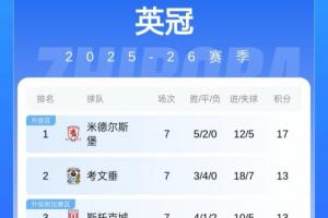 积分榜方面,米德尔斯堡5胜2平领跑,兰帕德执教的考文垂3胜4平排在第二。莱斯特城第5,伊普斯维奇少赛1场排在第12。