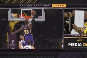 主持人邀请詹姆斯对自己湖人生涯的几大隔扣打分(10分制)。