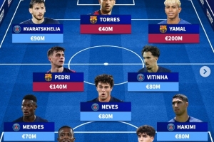 巴黎+巴萨目前身价最高11人阵:亚马尔领衔,K77、佩德里在列