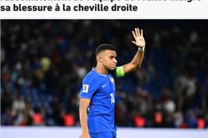 姆巴佩在对阵黄潜的比赛中破门,但下半场扭伤脚踝被换下。《队报》指出,姆巴佩在赛前就已略微扭伤的同一部位,此次扭伤又轻微加重了他的伤情。