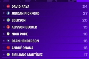 自2023/24赛季以来英超联赛零封场次排行榜